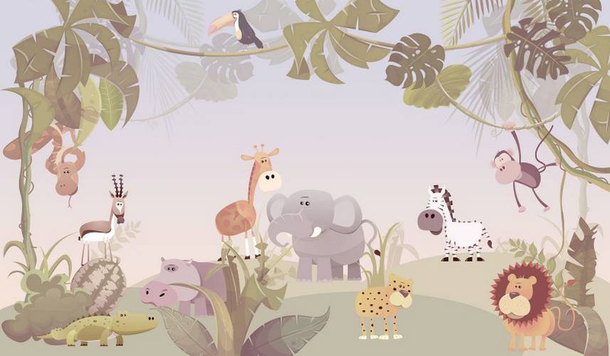 Kids от Ortograf (6765) – универсальны и на 100% соответствуют, если вы ищете обои следующих тематик: детские, животные, зебра, лев, обезьяны, пальма, птицы, тропики, тропические листья.