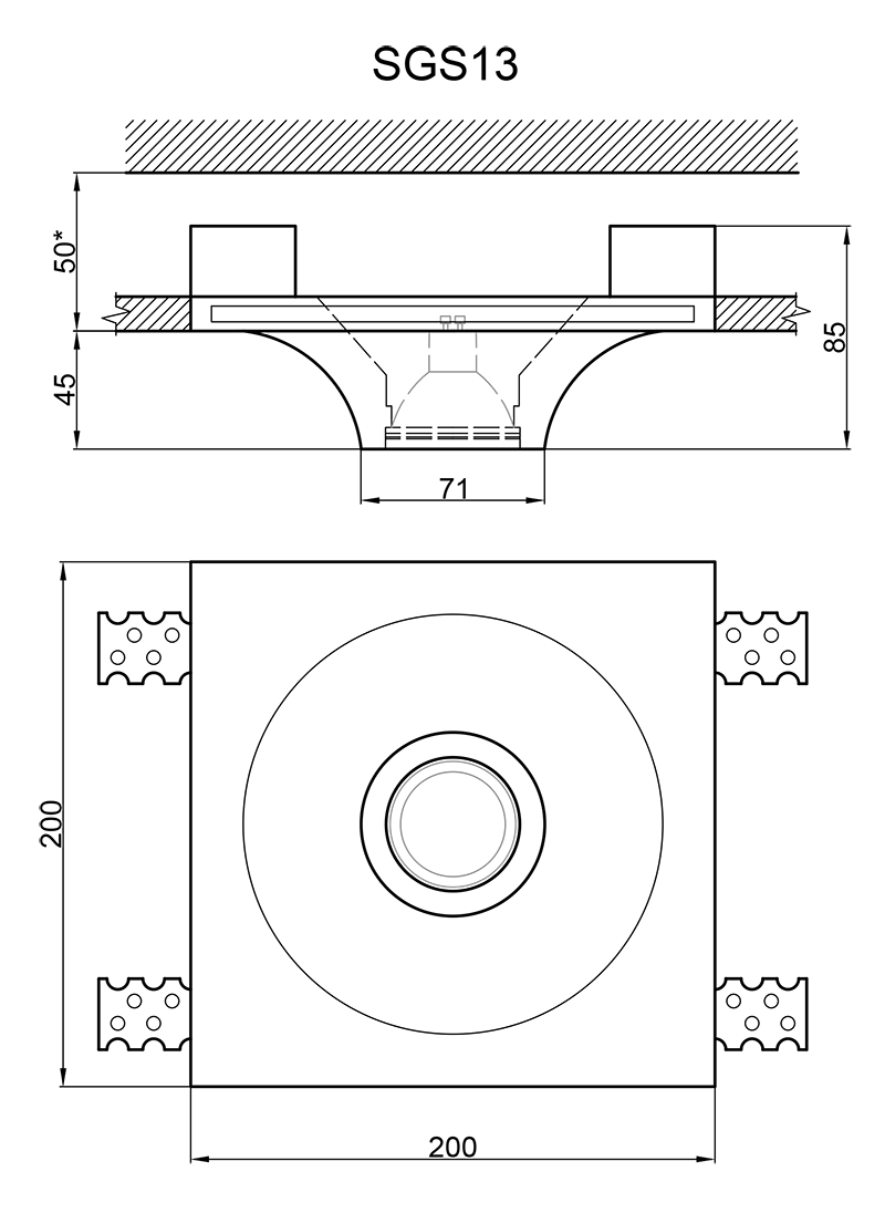 Материал: гипс Артикул: SGS13 Размер: 200x200x85 мм Монтажное отверстие: 205×205 мм Высота встраиваемой части: 40 мм Вес: 0,98 кг