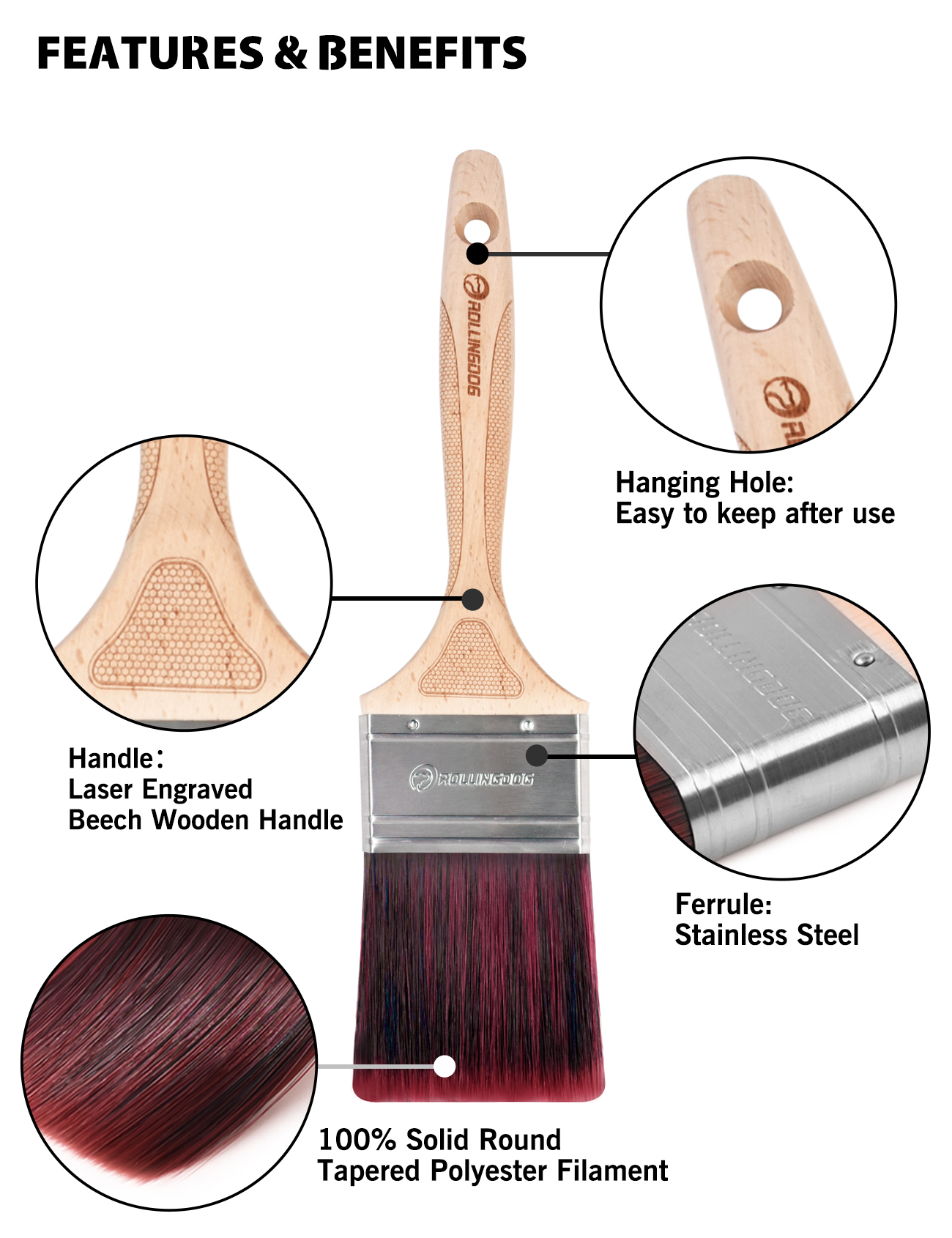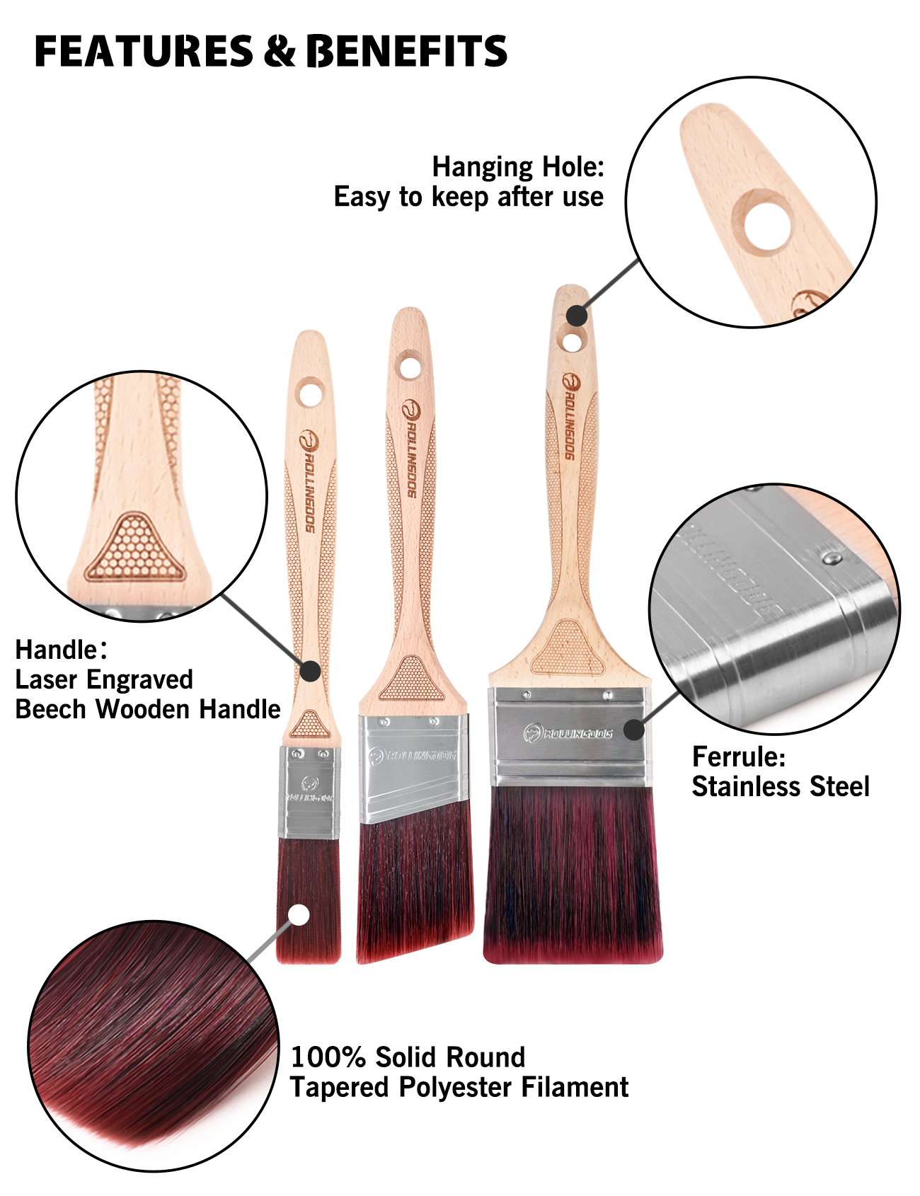 В этих кистях продумано все: эргономичная форма ручки из букового дерева, премиальная синтетическая нить, ободок из нержавеющей стали.