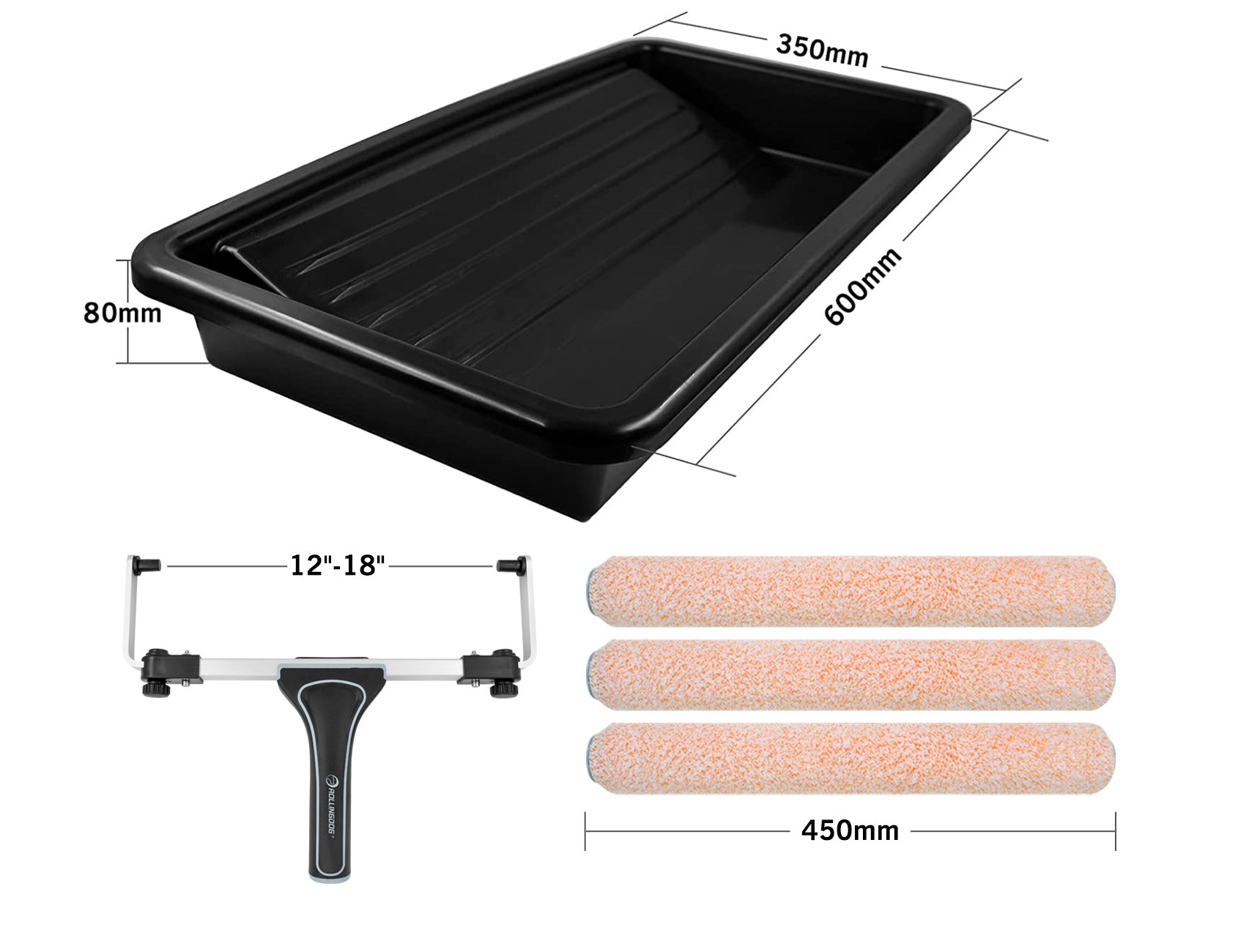 Набор малярный THE MOLOSSUS™, 5 предметов- 3 больших валика Super-Micro™ 18» (450 мм), ворс 9,5 мм.- бюгель Adjustable Roller Frame для больших валиков 30-45 см. (артикул 30089)- лоток для краски/крышка для ведра