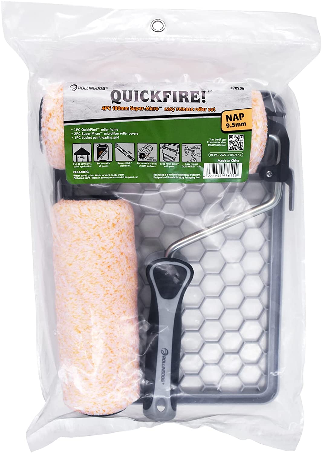 В наборе есть все необходимое для быстрой и качественной работы. Система QUICKFIRE!™ позволяет одним движением снять валик с бюгеля не испачкав руки. Валики из микрофибры подходят для всех видов краски.