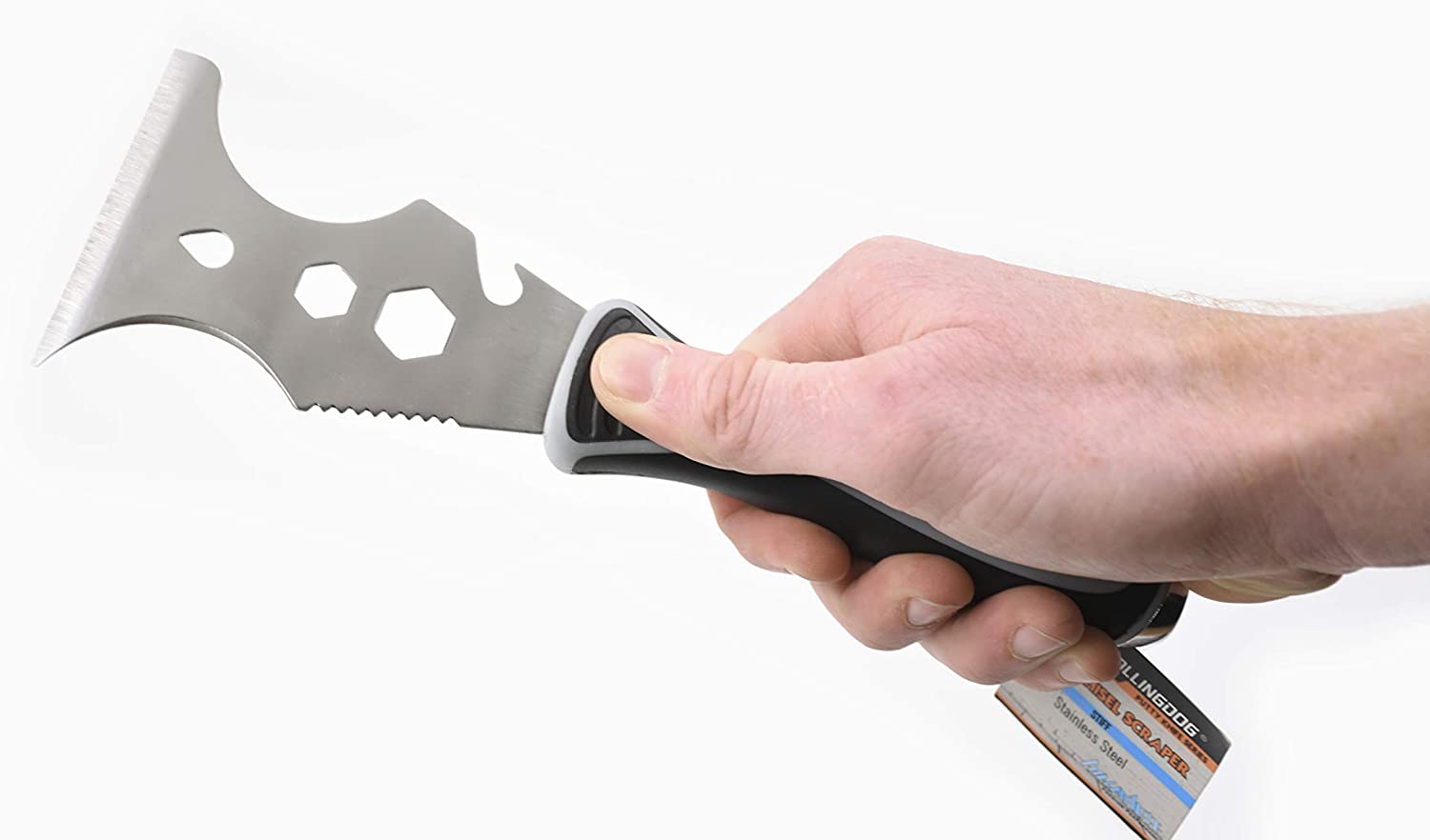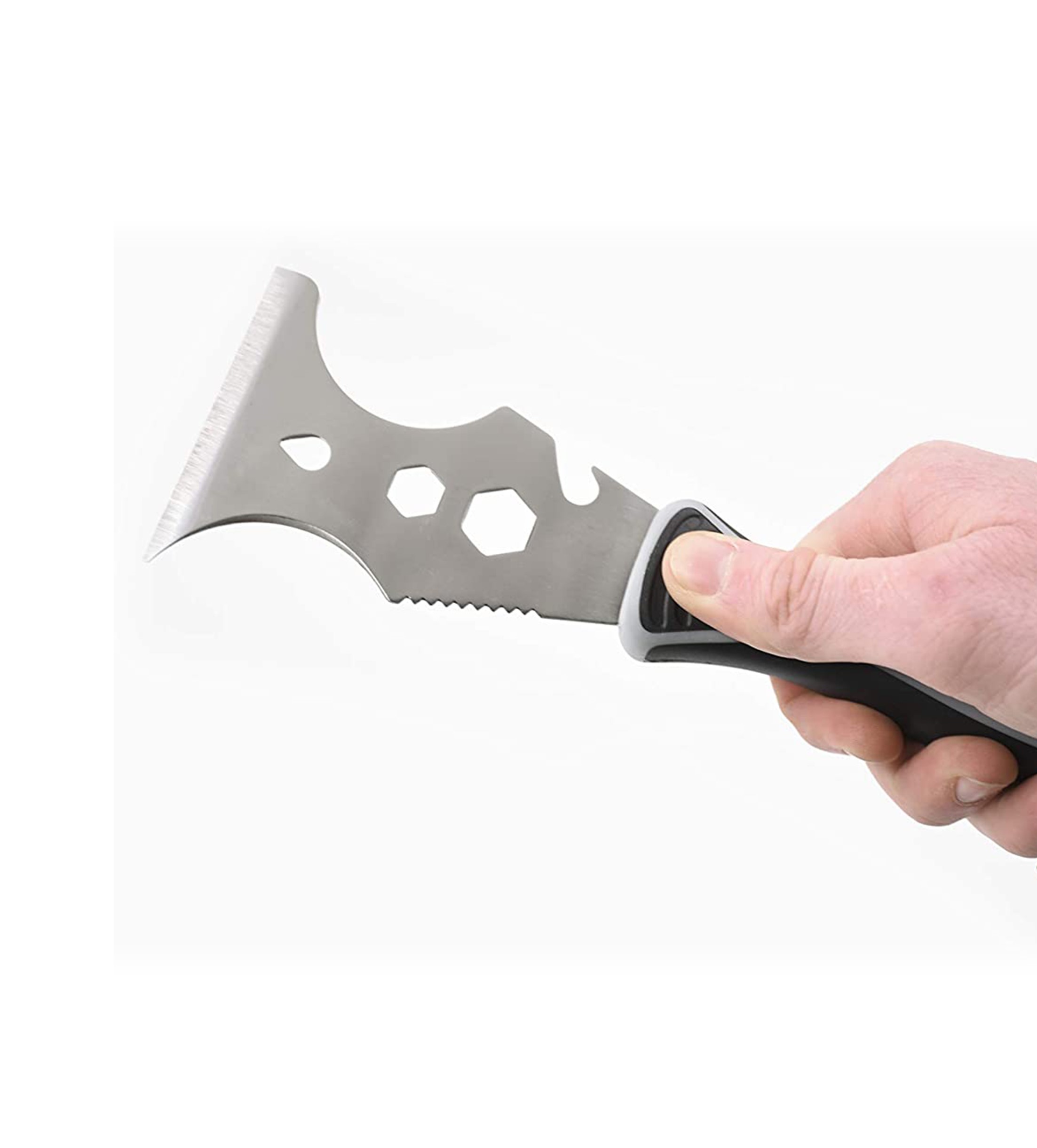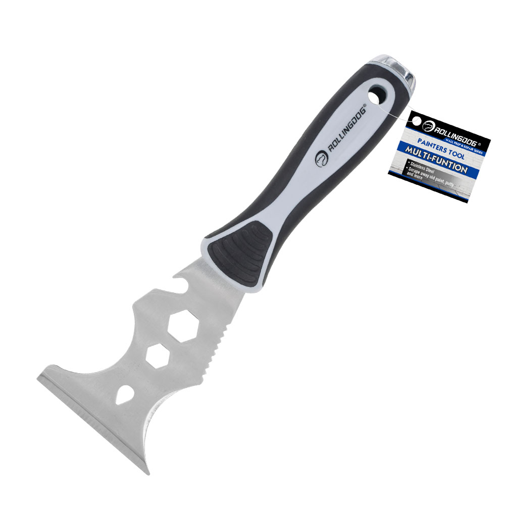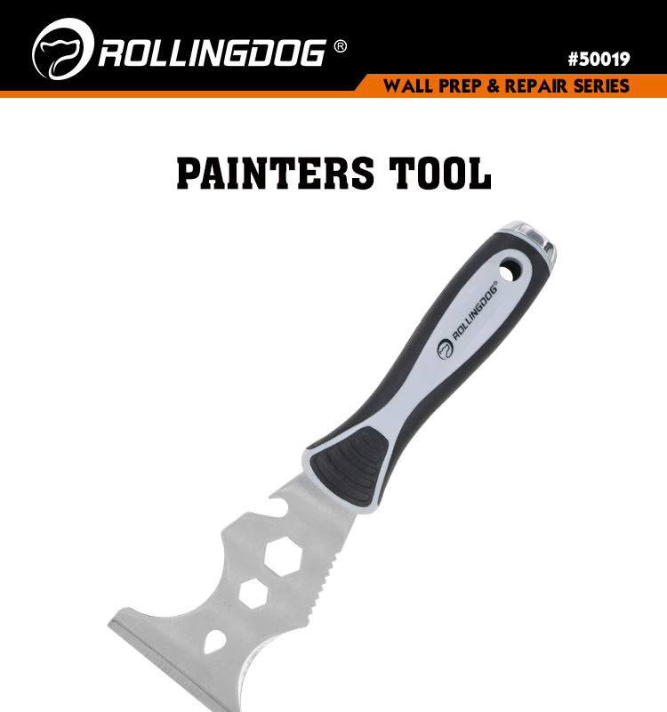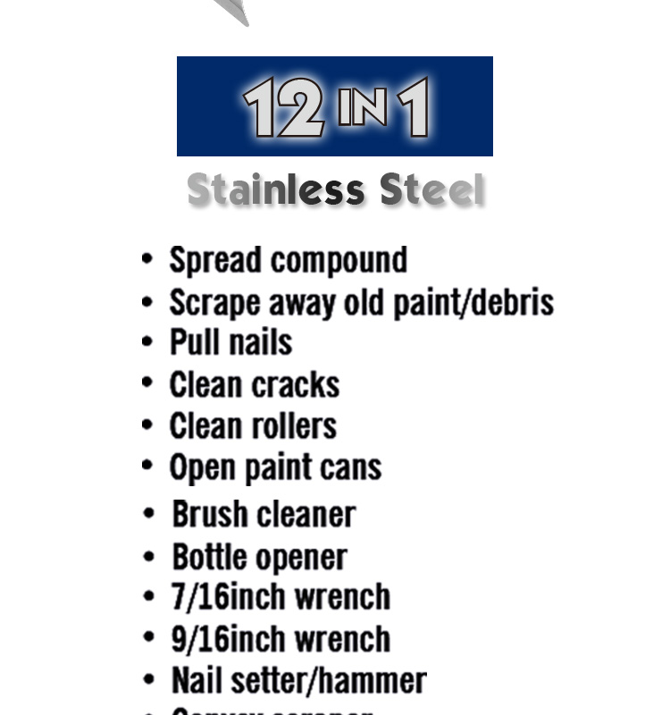 Высококачественное лезвие из нержавеющей стали № 430 для нанесения составов, соскабливания и очистки поверхностей, вытаскивания гвоздей, расшивания отверстий, открывания банок с краской и бутылок, очистки валиков и кистей, а также 7/16-дюймовый ключ, 9/16-дюймовый ключ, выпуклый скребок и металлический наконечник-молоток. Эргономичная ручка с резиновой рукояткой для легкого управления и удобного использования.