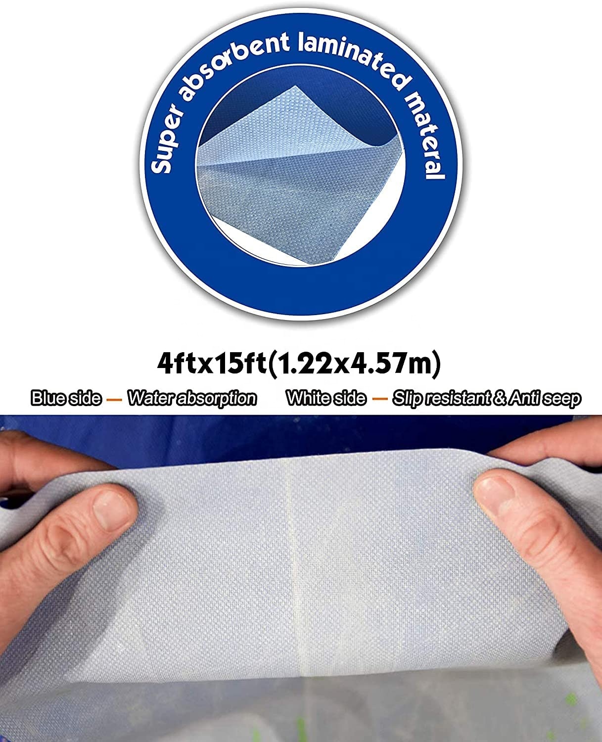 Двусторонняя укрывная ткань премиального качества. Синяя сторона – поглощает воду, белая сторона – устойчива к скольжению и протеканию. Сверхпрочная для многоразового использования.