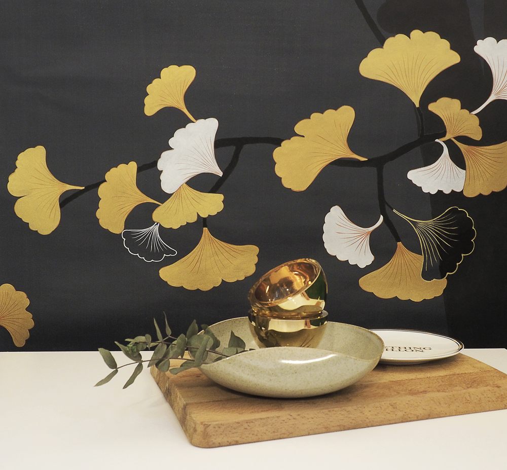 Asia от Misha (Ginkgo/Blue Petrolio) – универсальны и на 100% соответствуют, если вы ищете обои следующих тематик: азия, ар деко / art deco, ветки и побеги, листья гинкго, панно.