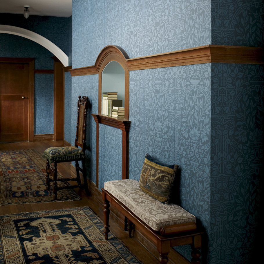 Цветовая гамма и орнамент обоев Morris & Co подчеркнут роскошность и стилистику интерьера.