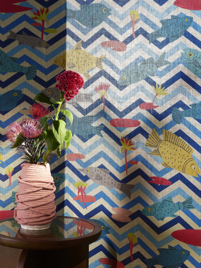 Merveilles D Egypte от Pierre Frey (FP893001) – универсальны и на 100% соответствуют, если вы ищете обои следующих тематик: геометрические фигуры, зигзаг, многоцветные, рыбы.