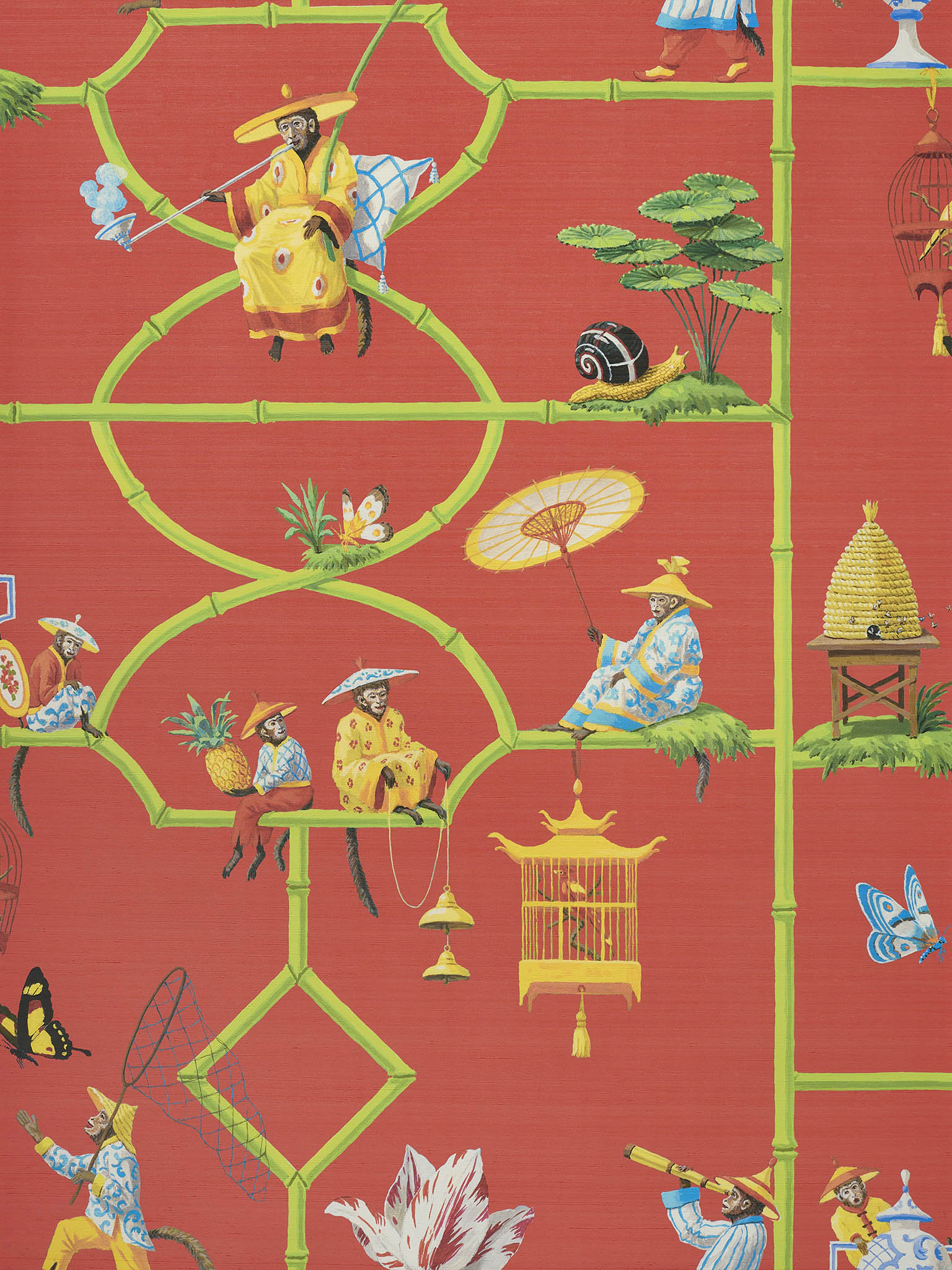Veranda от Pierre Frey (FP770003) – универсальны и на 100% соответствуют, если вы ищете обои следующих тематик: азия, восток, имитация шелка, обезьяны, пагода, шинуазри / chinoiserie.